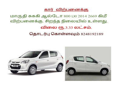 MARUTHI SUZUKI ALTO 800 LXI CAR FOR SALE 2014, 2660 KM 3.3Lacs - Cars for sale, used cars for saleRef. number: 3203408 Updated: 11-09-2025 06:17